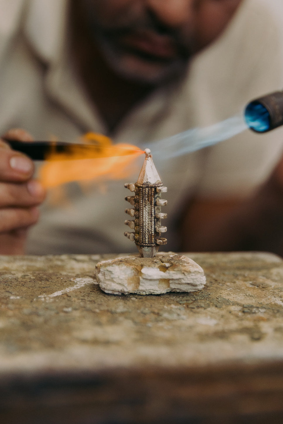 Nous sommes extrêmement fiers de nos collaborations avec deux entreprises familiales basées au Rajasthan, en Inde. Ces entreprises se sont consacrées à l'art de la joaillerie depuis deux à quatre générations ! Actuellement en pleine croissance remarquable, leur vision est de contribuer à la préservation et à la promotion du riche patrimoine et de l'artisanat traditionnel de l'Inde. Ce qui nous excite encore davantage, c'est que le Rajasthan abrite certaines des communautés artisanales traditionnelles les plus accomplies et les plus talentueuses au monde. Nous sommes profondément engagés à veiller à ce que ces pratiques anciennes perdurent non seulement, mais aussi qu'elles reçoivent la reconnaissance et le respect qu'elles méritent vraiment. Bien que le fait main reste notre préférence principale, nous avons également introduit quelques designs réalisés par moulage pour améliorer des fonctionnalités spécifiques. Étant donné que la plupart de nos créations sont fabriquées à la main, ces pièces moulées offrent des avantages uniques dans certains contextes.